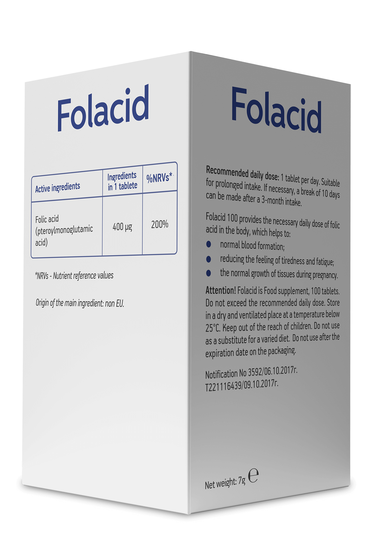 Folacid 100 ја обезбедува потребната дневна доза на фолна киселина за избалансирани процеси во телото, го намалува нивото на штетниот хомоцистеин[4] кој ги оштетува кардиоваскуларниот и нервниот систем и ја стимулира синтезата на невротрансмитери во мозокот.[5], [6]